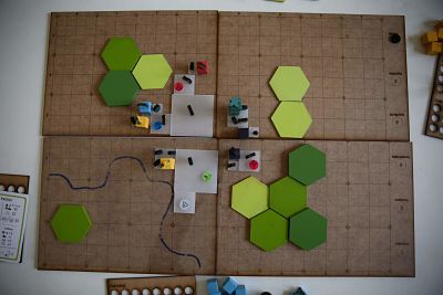 El juego se compone de un (1) tablero divido en cuadriculas, donde se construye de forma progresiva una ciudad. En el tablero se localizan montañas y ríos que
